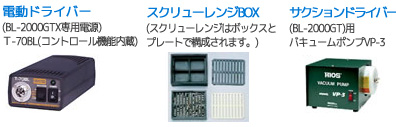 BL-2000GT購入の際は、本体の他に下記が各1セットずつ(電動ドライバー, スクリューレンジBOX, サクションドライバー)とマウスピース(口金)1個、ビット10本のセット販売させて頂きます。